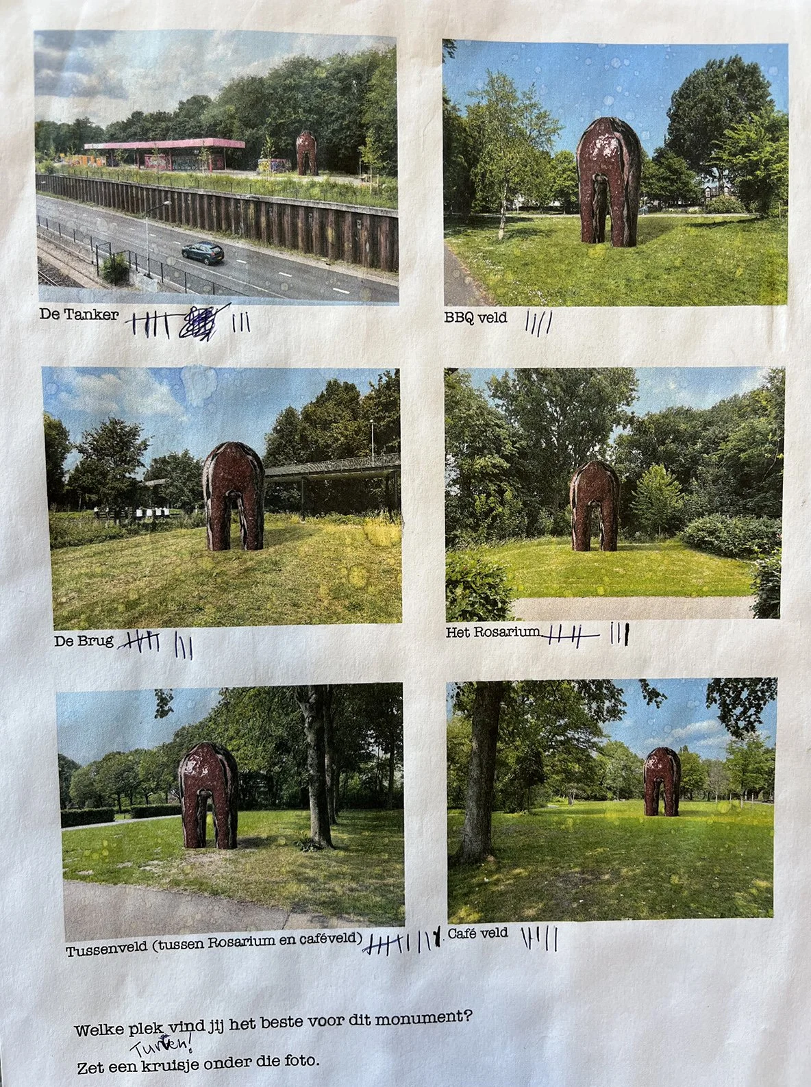 This is how the public liked the 6 locations. Overall, they liked the idea of a monument very much, and they also liked the Monument, as a sculpture. On some locations, the Monument could be 7 meters high, on others 4 meters would be enough. Doors in the Monument were not a good idea.
